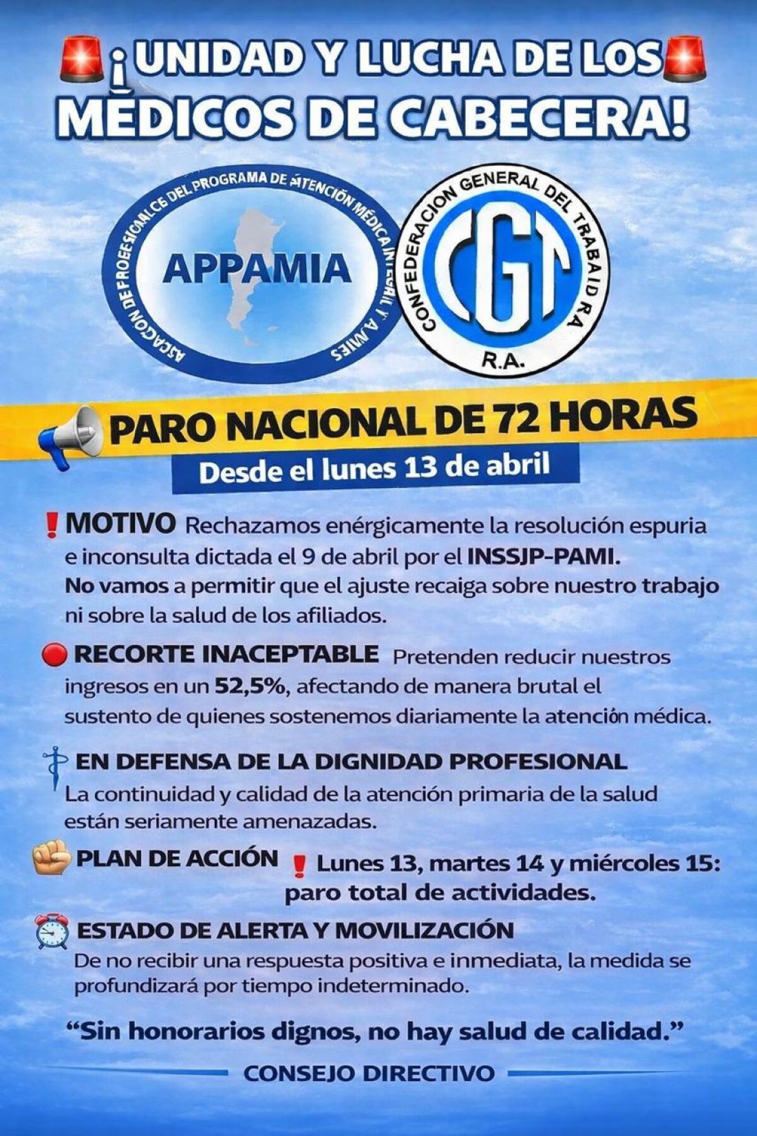 En la provincia, jubilados y jubiladas reportaron la suspensión de los turnos por la medida de fuerza, nacida a partir de la normativa 2026-1107-INSSJP-DE y que dispone modificaciones en el Nomenclador Común del Instituto, como así también en el de médicos de cabecera. Si bien la resolución actualiza desde abril el pago de 945 a 2.100 pesos la cobertura por afiliado, en paralelo, elimina el reconocimiento de las consultas que, hasta antes de la resolución, podían llegar hasta las 140 mensuales. También se elimina el incentivo económico destinado a la formación de posgrado de los médicos de cabecera.