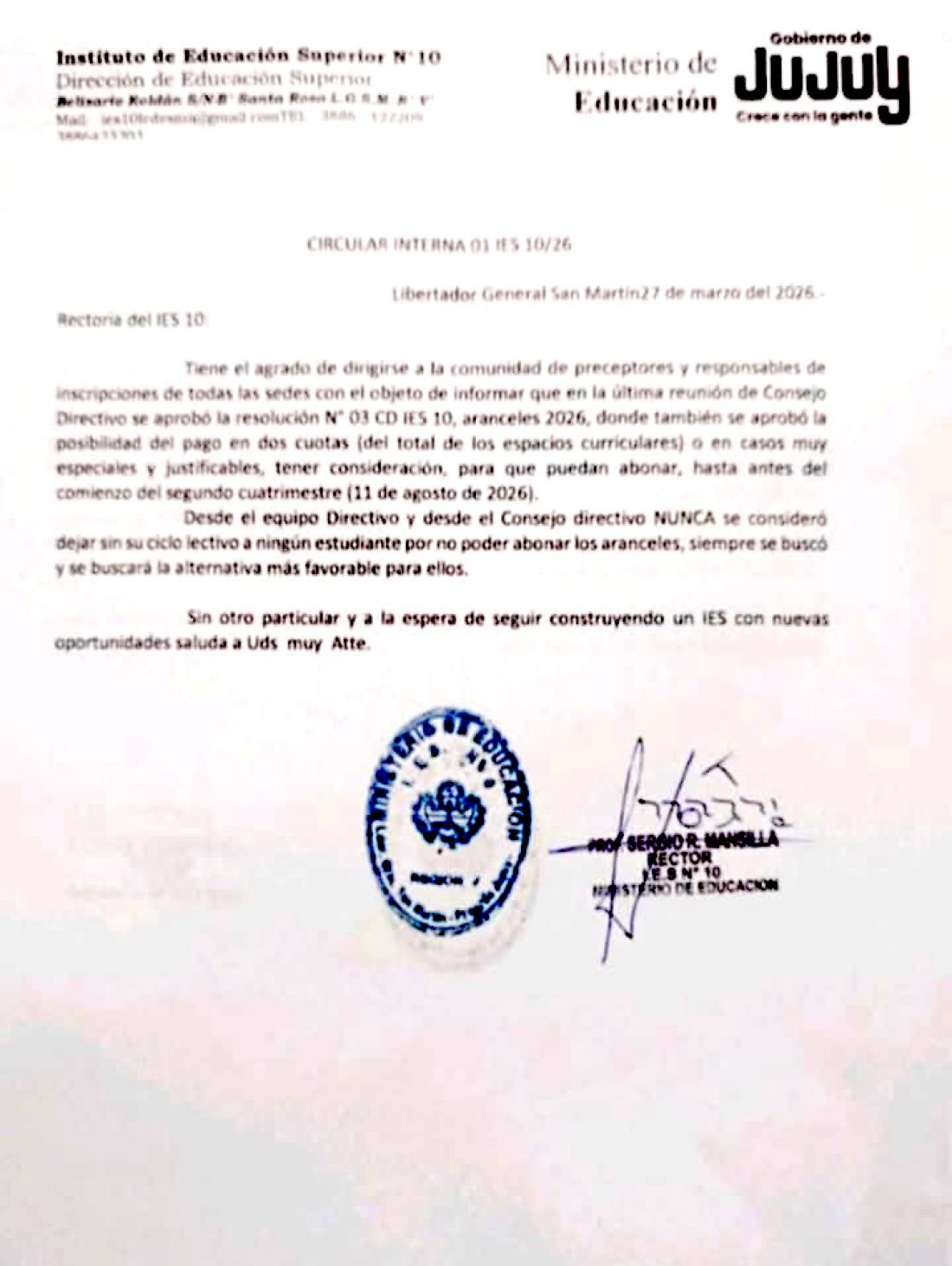 Por su parte, el Consejo Directivo tuvo que salir a aclarar sobre la nueva disposición de los montos a pagar para acceder a las carreras del IES Nº10 y expusieron en un comunicado que “nunca se consideró dejar sin su ciclo lectivo a ningún estudiante por no poder los aranceles, siempre se buscó y se buscará la alternativa más favorable para ellos”.