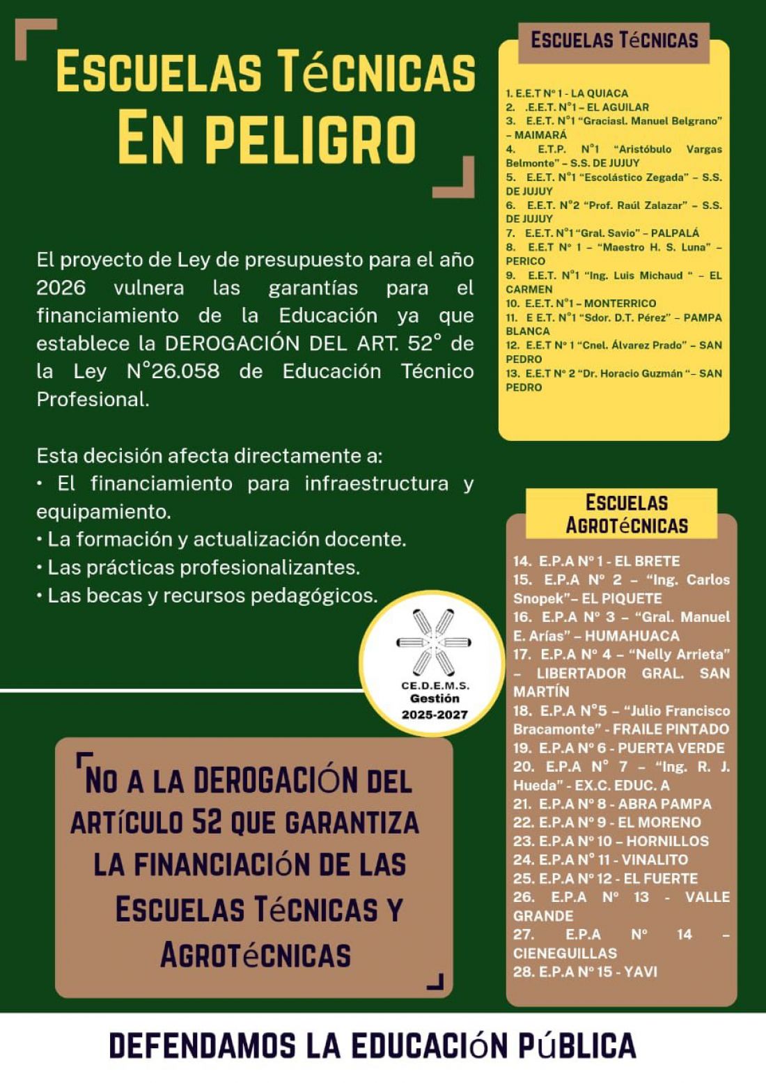 Sin este fondo especial, el sindicato indicó que son 13 las escuelas técnicas y 15 agrotécnicas afectadas en Jujuy: respecto a las primeras, se ubican en La Quiaca, El Aguilar, Maimará, San Salvador de Jujuy (con 3 establecimientos), Palpalá, Perico, El Carmen, Monterrico, Pampa Blanca y dos en San Pedro. En tanto, las agrotécnicas en peligro están se encuentran en El Brete, El Piquete, Humahuaca, Libertador General San Martín, Fraile Pintado, San Pedro, Perico, Abra Pampa, El Moreno, Hornillos, Vinalito, El Fuerte, Valle Grande, Cieneguillas y Yavi.