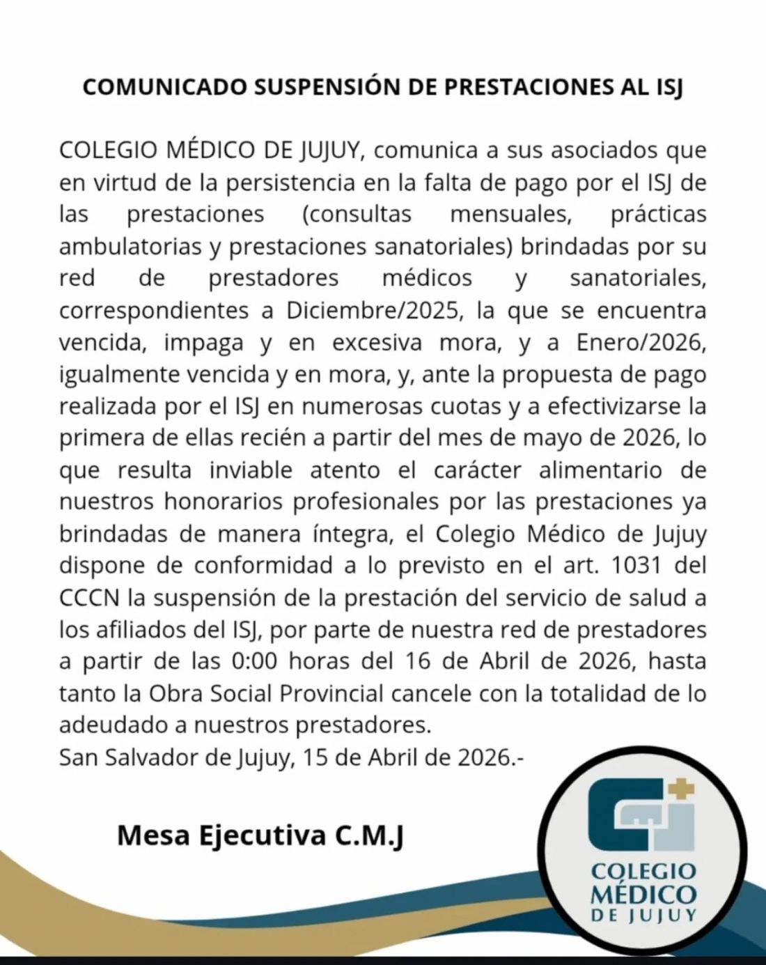 Fue en la jornada del miércoles que el Colegio Médico de Jujuy informaba “ante la falta de pago de las prestaciones de diciembre y enero y una propuesta de cuotas inviable por parte del Instituto, el Colegio Médico de Jujuy suspende los servicios a partir de las 00:00 hs de este jueves 16 de abril”.