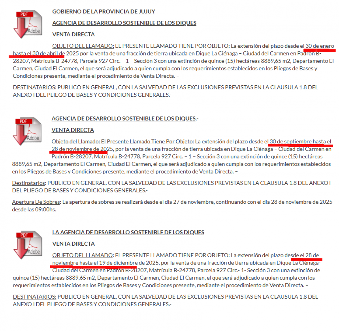 Tal como señala la convocatoria, oferentes podrán presentar la documentación requerida desde el 28 de noviembre hasta el 19 de diciembre de 2025, siendo esta la tercera vez que la Agencia intenta hacer usufructo de las tierras que tiene en disputa con familias campesinas y esperan que la Corte Suprema de Justicia de la Nación resuelva el amparo presentado en 2017. Ya había hecho la misma licitación en enero y septiembre.