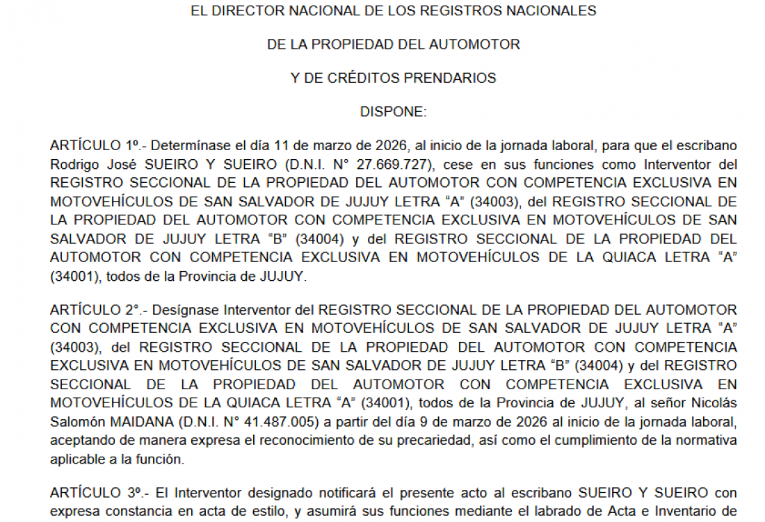 El Registro del Automotor con competencia en Motovehículos (motos) situado en calle Pte. Roca 178 de esta ciudad permanece cerrado desde el 30 de Enero, es probable que reabra sus puertas los primeros días de abril en la sede del Registro de San Pedro de Jujuy. Este cambio drástico, se debe a la designación por parte de la DNRPA como nuevo interventor a Nicolás Maidana al frente del registro de San Salvador, anexándola a su actual labor como Interventor del Registro de San Pedro de Jujuy. La decisión surge del director nacional de los registros nacionales de la propiedad del automotor, en una disposición que tiene fecha de 10 de marzo 2026.