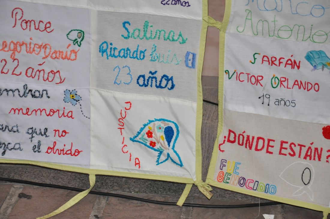 Esos bordados le dieron color al acto central ayer. Algunos paños aportaban alguna característica de la persona recordada, el apodo, la identidad, el registro de la memoria que permanece encendida, las localidades de donde fue secuestrada, anécdotas.