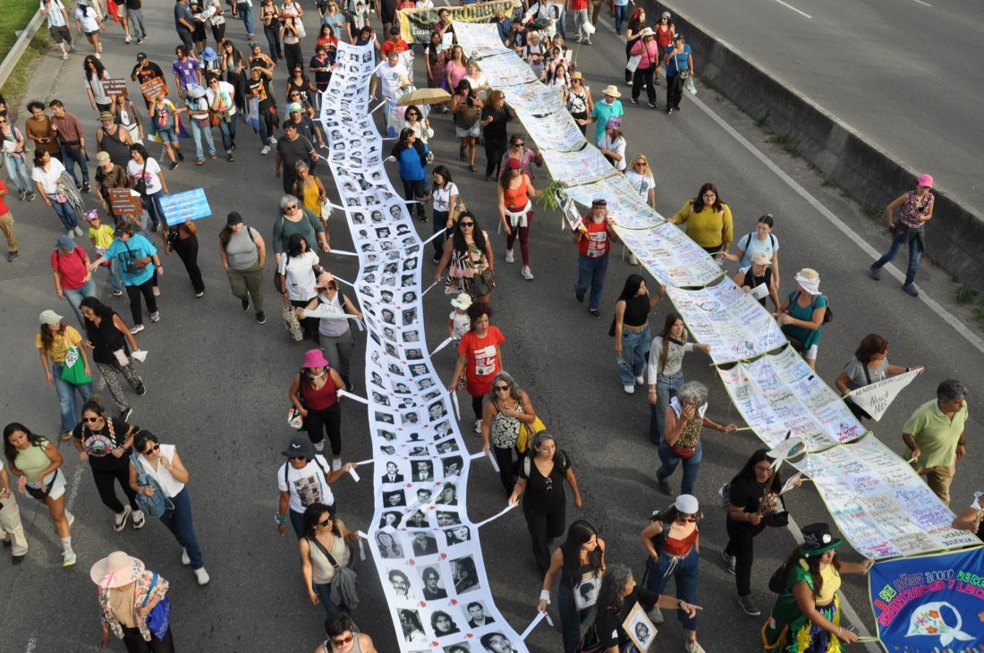 Luego se hizo la marcha, acompañada por el sonido de anatas, sikus, quenas y bombos. La columna llevó miles de banderas, con consignas: “Nunca Más”, “Son 30 mil”, “Ni olvido ni perdón”. Además, muchos niños, niñas y adolescentes marcharon con pañuelos intervenidos y carteles.