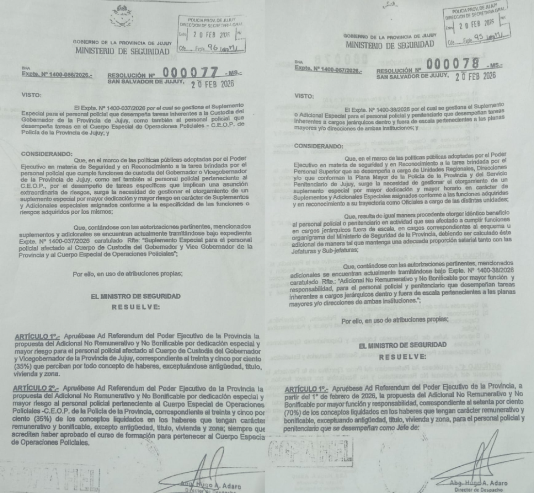 El secretario de Seguridad, Juan Manuel Pulleiro resuelve aprobar -ad referéndum del Poder Ejecutivo- que a partir del 1 de febrero de 2026 la propuesta adicional implica el 70% de los conceptos liquidados en los haberes que tengan carácter remunerativo y bonificable, exceptuando la antigüedad, titulo, vivienda y zona para personal policial y penitenciario que se desempeñe como jefe.