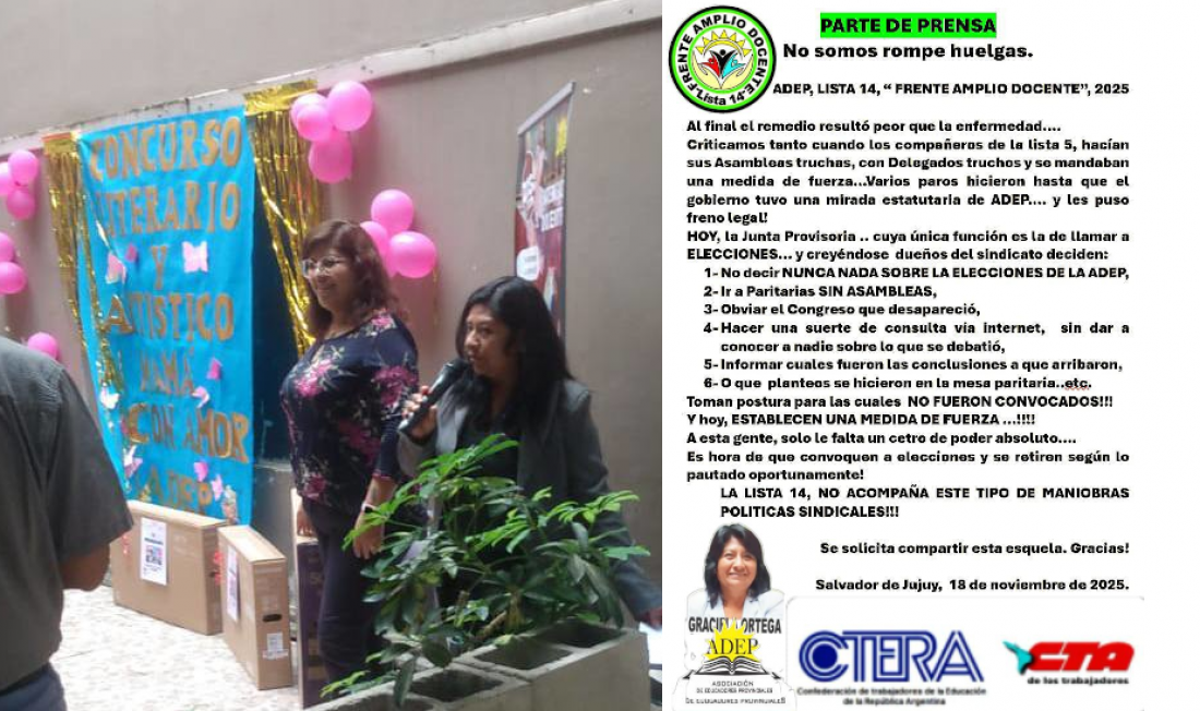 Por su parte, desde la agrupación Hormiguero Docente -que forma parte de la lista Naranja, que el mismo día de la elección manifestó haber obtenido un triunfo contundente sobre la lista 10 que encabezaba Silvia Vélez, quien reapareció en el Congreso irregular- cuestionó la reciente renuncia de Ortega y apuntó “estas señoras se asociaron y ahora se pelean usando a los docentes en medio de una lucha salarial, fueron a paritarias sin asambleas, no activaron el congreso, están haciendo gastos sin tener potestad para ello, están manipulando el padrón y usando a los docentes. Esto es lo peor que le podía pasar a un gremio quedar en acefalía porque las dos listas que estás dos personas representan no acortaron perder, se autoproclamaron y ahora se pelean por quien sabe cuánto. Están todos con licencia por artículo 50 a consideración del Ministerio o sea gobierno y no son capaz de ir por las escuelas, llamar a asamblea, mientras vos maestra, maestro estás penando porque reconocimiento te autorice dos días” y concluyeron “el gobierno es cómplice de todo esto”.