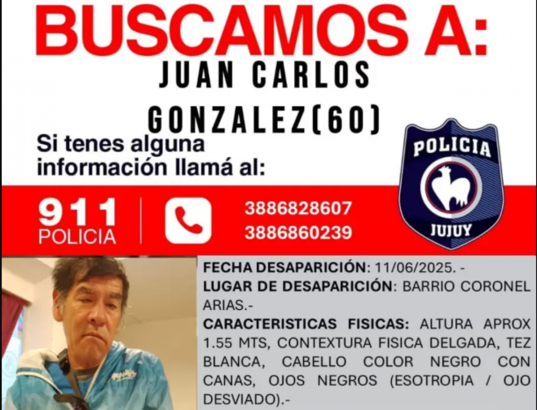 Se trata de Juan Carlos González, de 60 años, desaparecido el 11 de junio, la desaparición fue denunciada el 13 de junio. Era trabajador municipal, la familia lo buscó y la antena de su celular impacto en cercanía al domicilio de Jurado, en el barrio 8 de Marzo en Alto Comedero.