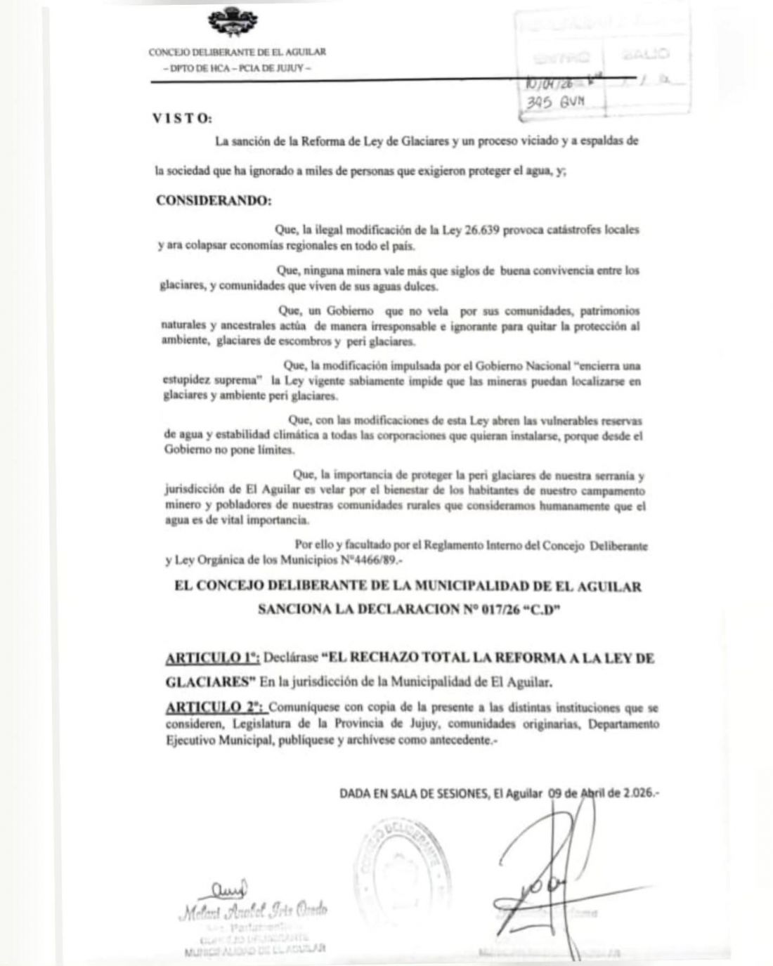 Ante lo que consideró el Concejo Deliberante de El Aguilar se producirá una situación de vulnerabilidad de las reservas de agua y estabilidad climática, la ordenanza busca “velar por el bienestar de los habitantes de nuestro campamento minero y pobladores de nuestras comunidades rurales que consideramos humanamente que el agua es de vital importancia”.