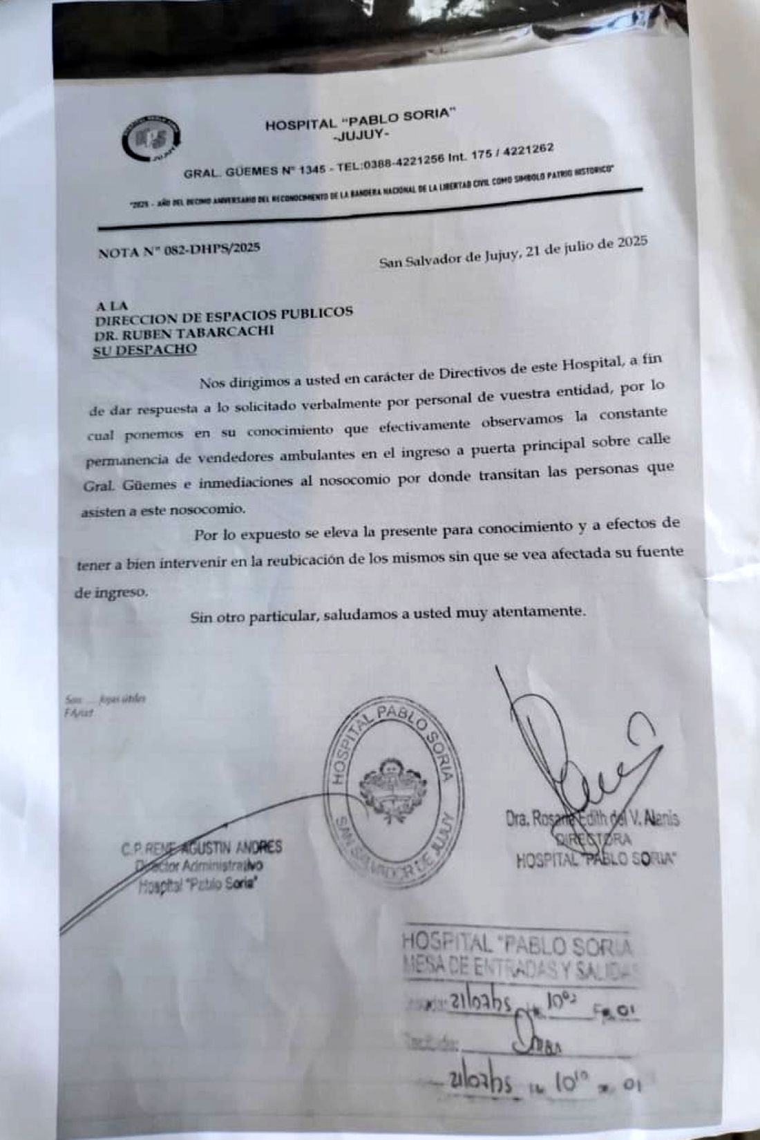 Según indica el documento, el funcionario municipal mantuvo un encuentro con directivos del nosocomio en la cual se planteó el tema de la dificultad en la libre circulación en uno de los ingresos a la unidad médica, por lo que volvieron a pedir una solución a la “constante permanencia de vendedores ambulantes en el ingreso de la puerta principal sobre calle Güemes e inmediaciones al nosocomio por donde transitan las personas que asisten”.