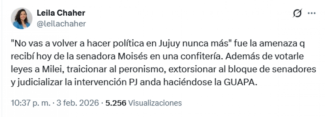 Chaher publicó la situación por la gravedad y el enojo de la senadora por la resolución de los interventores. Asimismo, llamó a la cordura a Moisés y le recordó su inconducta partidaria y le señaló “no se puede naturalizar que votar con Milei y acordar con Gerardo Morales la entrega del país y de Jujuy sea en nombre del peronismo. Quienes crean en esas ideas son libres de hacerlo con su propio partido, que además si lo tiene”.