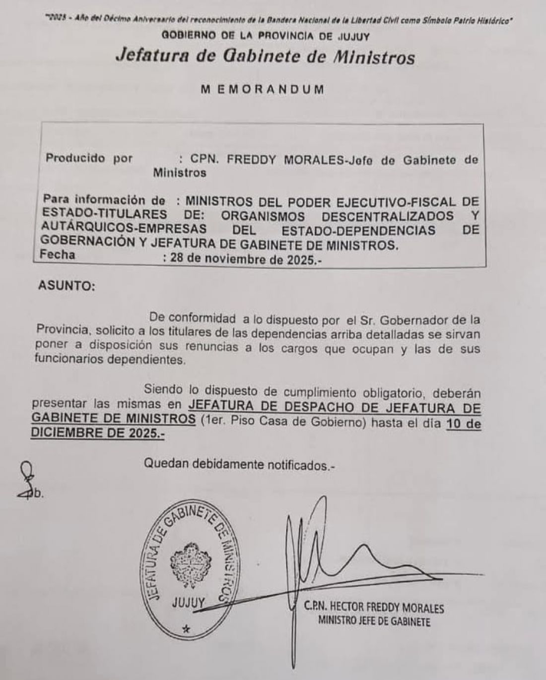 Sin embargo, lo llamativo es que el memorándum, si bien indica que es por una orden del gobernador, el mismo sólo lleva la firma de Freddy Morales.